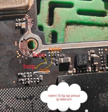 ISP Pinout refers to a set of contact points on the mainboard of the Redmi 13 5G, used for low-level firmware flashing or recovery operations. These pins allow direct communication with the internal memory using specialized hardware tools such as UFI Box, JTAG, or other supported programming devices. By accessing these pins, technicians can perform tasks like unbricking, bypassing FRP, or flashing stock ROMs — all without removing the memory chip from the motherboard.